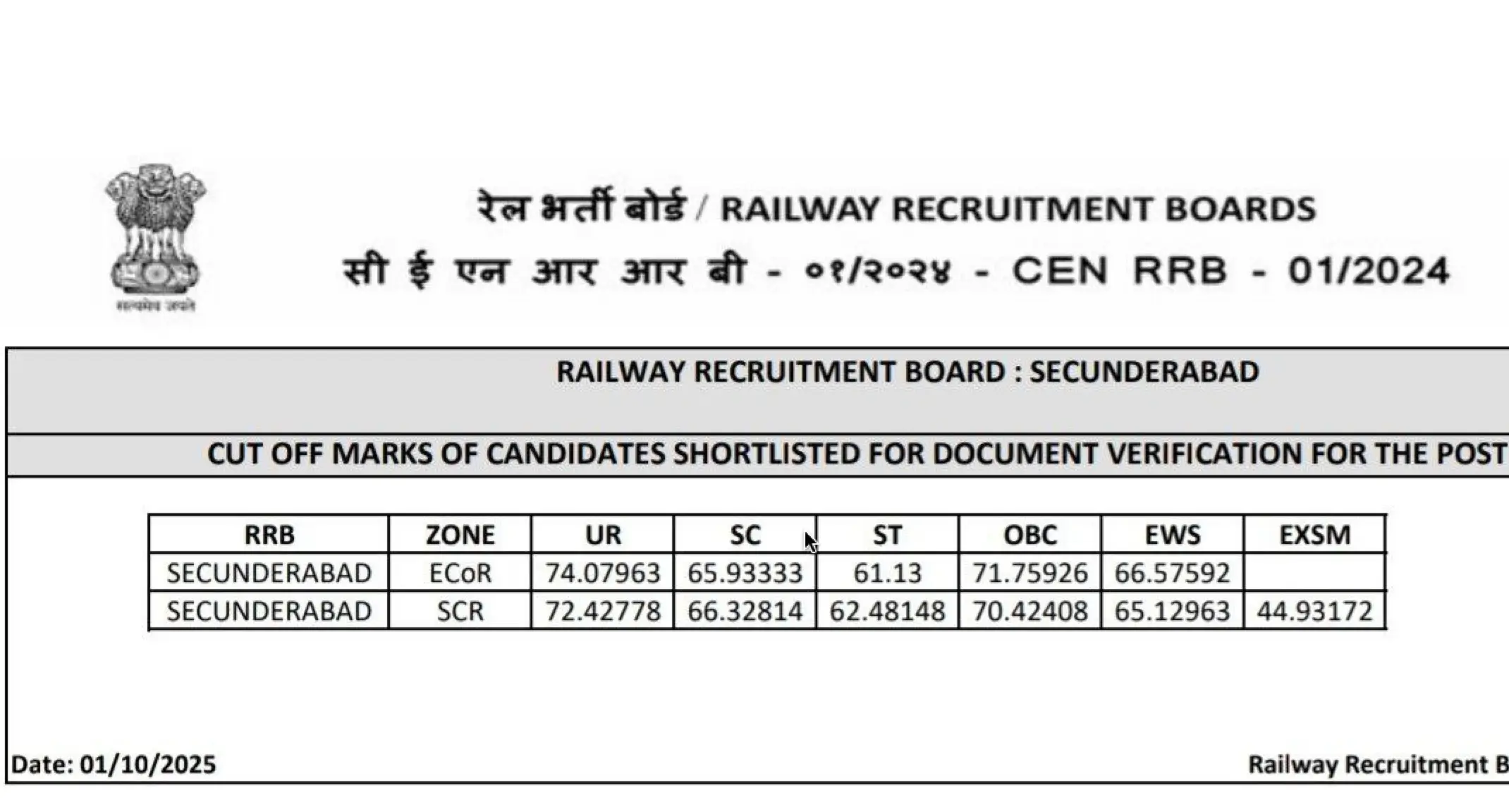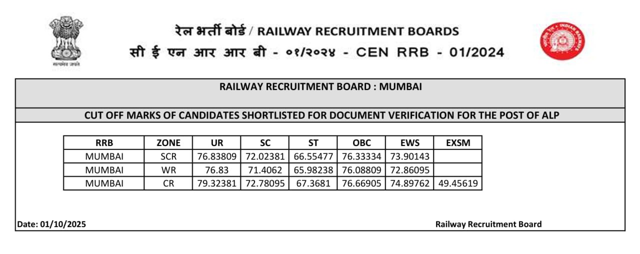 Railway RRB ALP 01/204 CBAT-I Exam Result/ Cutoff/ Score Card 2025 Out