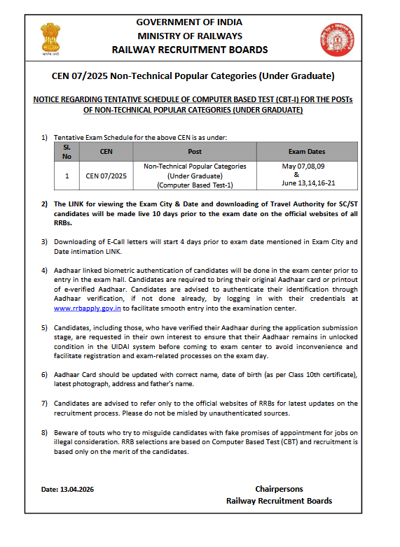 Railway Recruitment Board (RRB): Short DetailsRailway RRB NTPC 10+2 Under Graduate Exam Date 2026 |